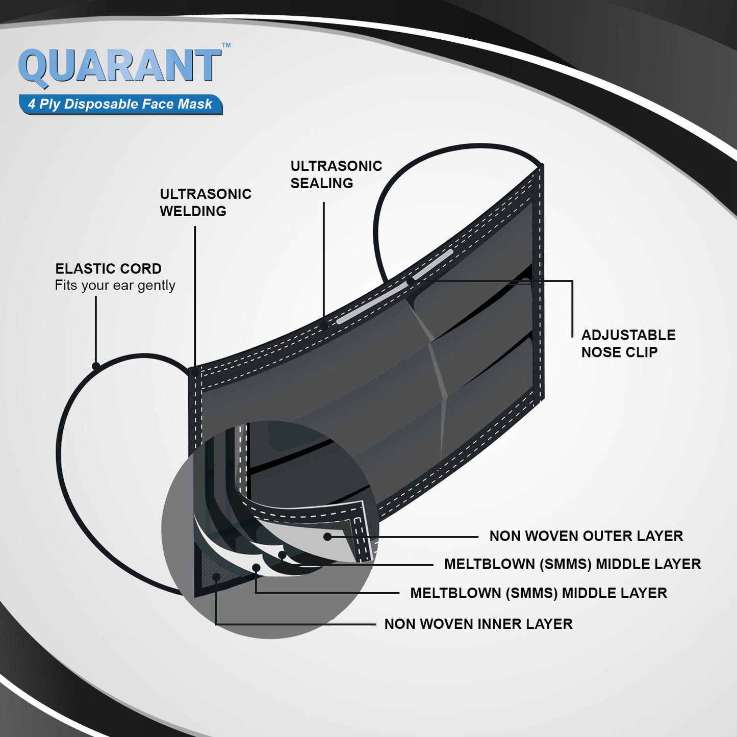 QUARANT 4 Ply Black Disposable Face Mask with Dual Meltblown SMMS Fabric Layers and Adjustable Nose Pin - Pack of 100
