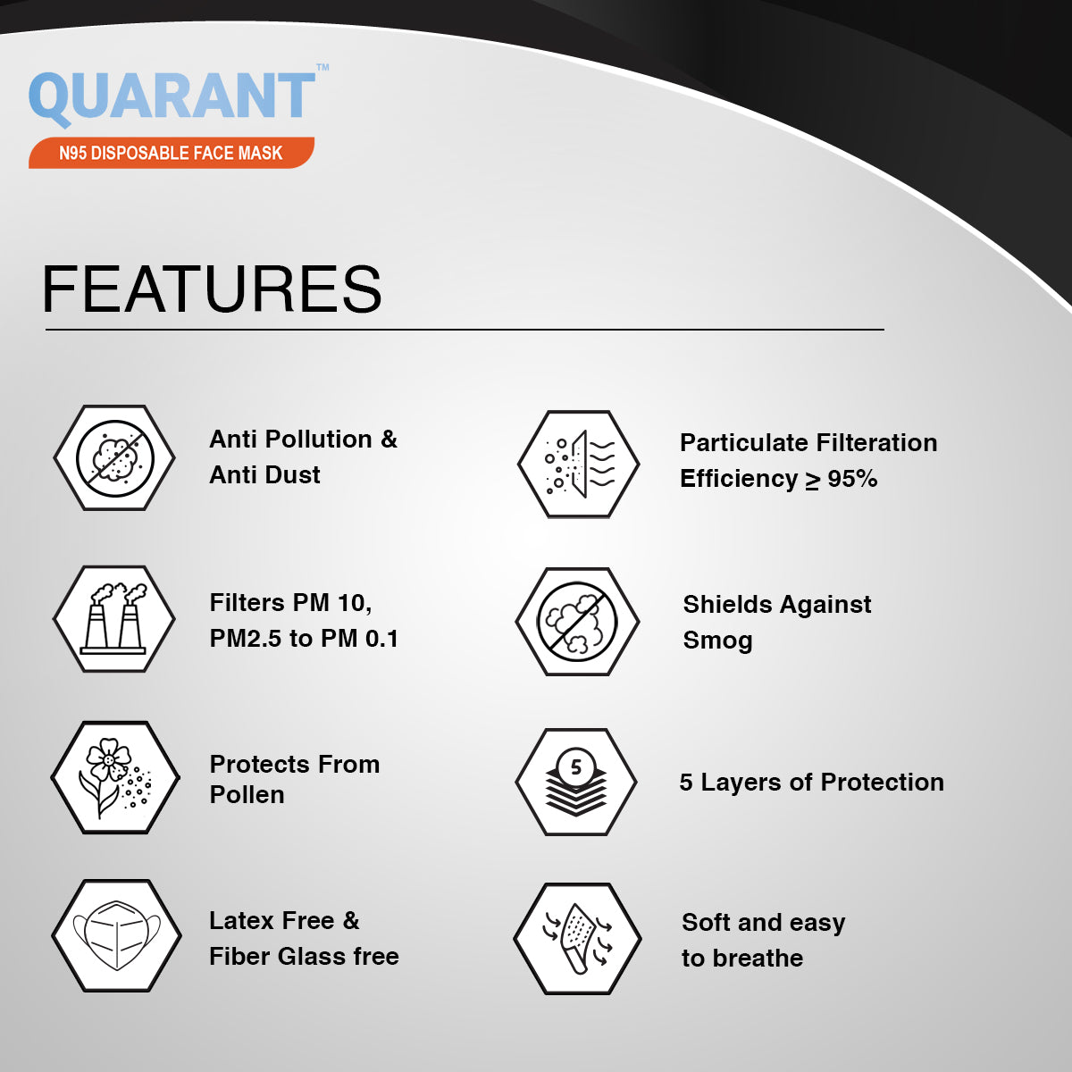 - 5 Layers Protection: Exterior Layer: Hydrophobic Non-woven fabric, Center Layer 1: Meltblown filter, Center Layer 2: Hot Air Cotton Filtration, Center Layer 3: Meltblown filter, Inner Layer: Hydrophilic skin friendly fabric.