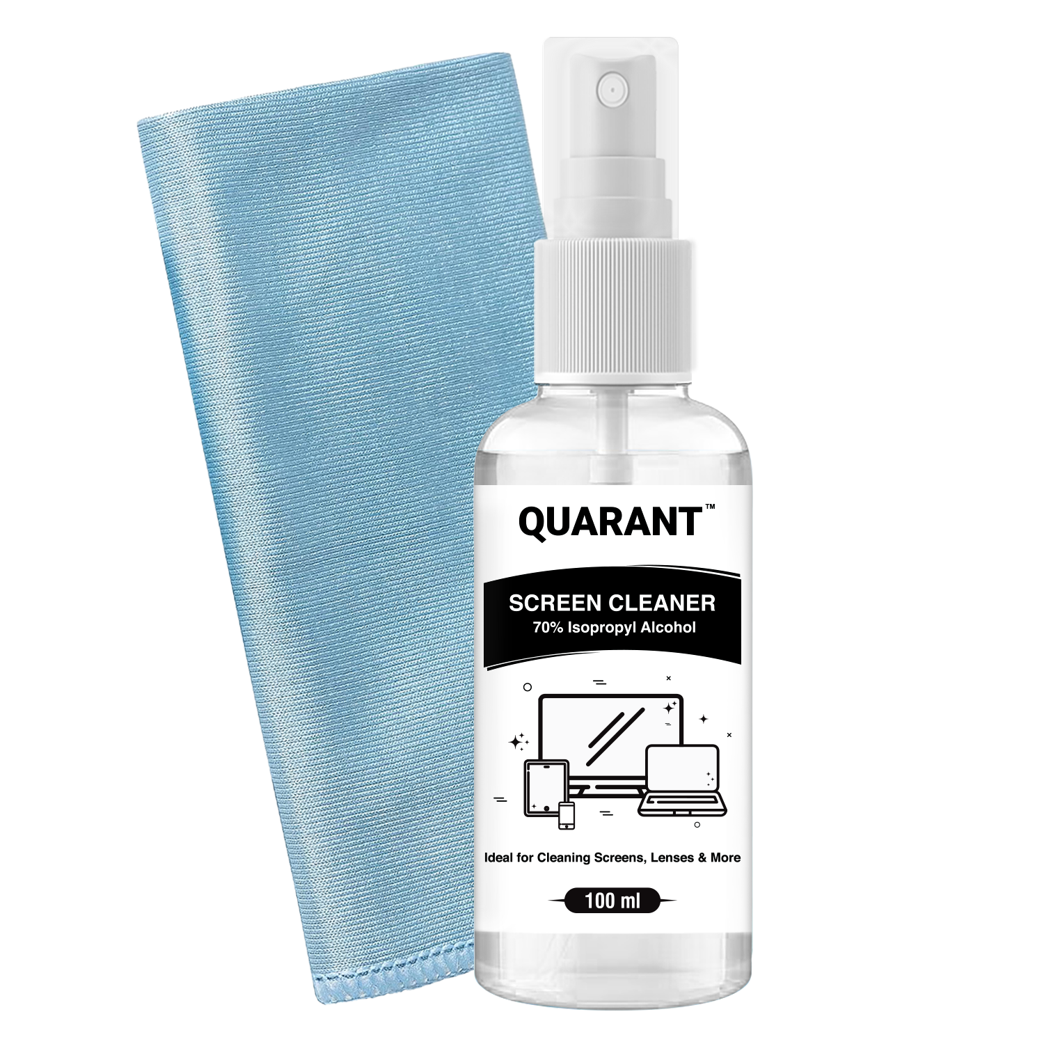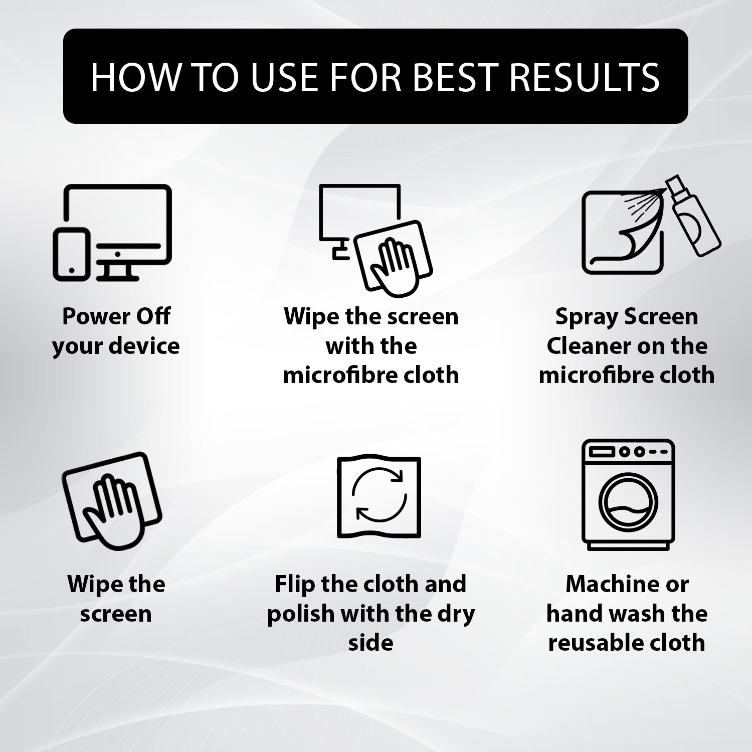 The kit includes a 100 ml Screen Cleaner Liquid Spray Bottle with 70% Isopropyl Alcohol & a 300 GSM Dual Sided 40x40 cm Microfiber Cloth